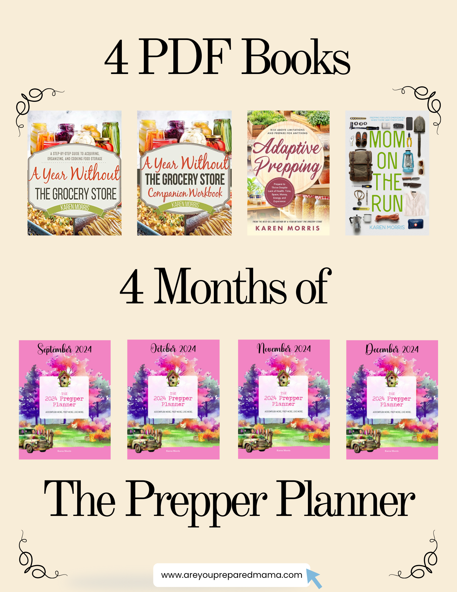 This four pack of my books and workbook is all about helping you get ready ahead of time for those unexpected snags.  This is a collection of PDF’s of my three books:  A Year Without the Grocery Store, Mom on the Run, and Adaptive Prepping.  A PDF of my workbook – A Year Without the Grocery Store is also included in this bundle.  AND four months of The Prepper Planner.